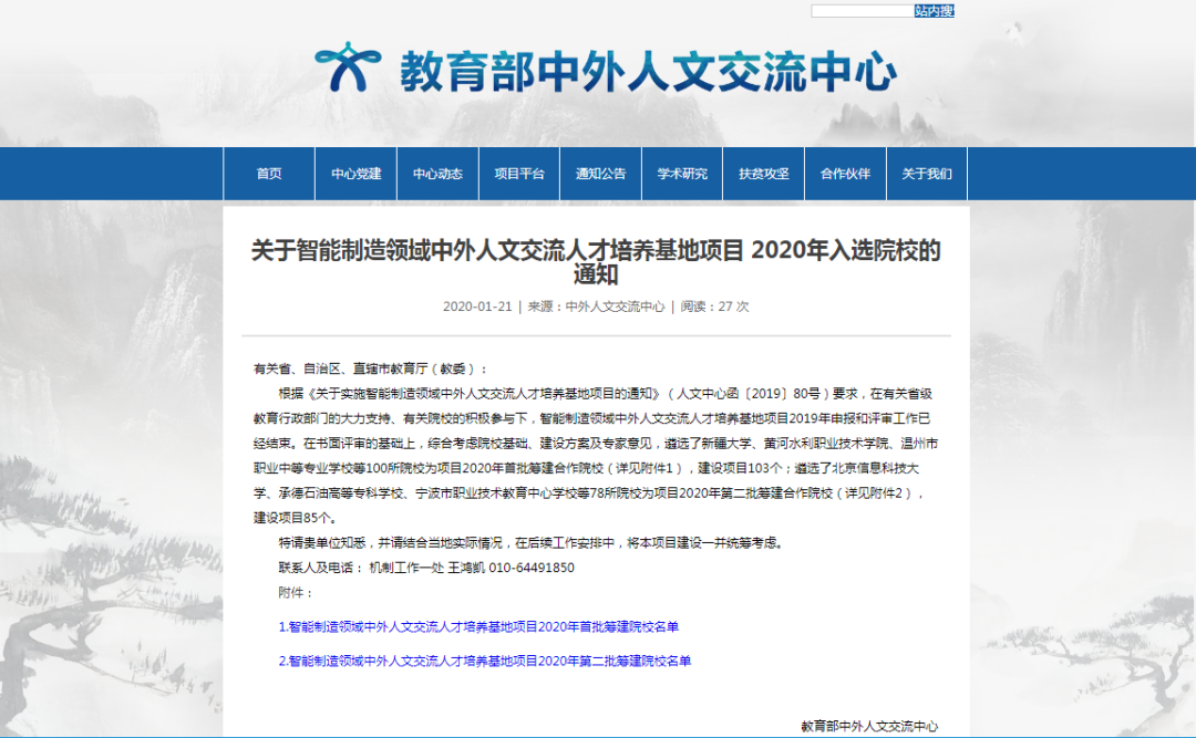 近日,我校被教育部中外人文交流中心遴选为智能制造领域中外人文交流人才培养基地项目2020年首批100所筹建合作院校(含本科、高职高专和中职学校)。